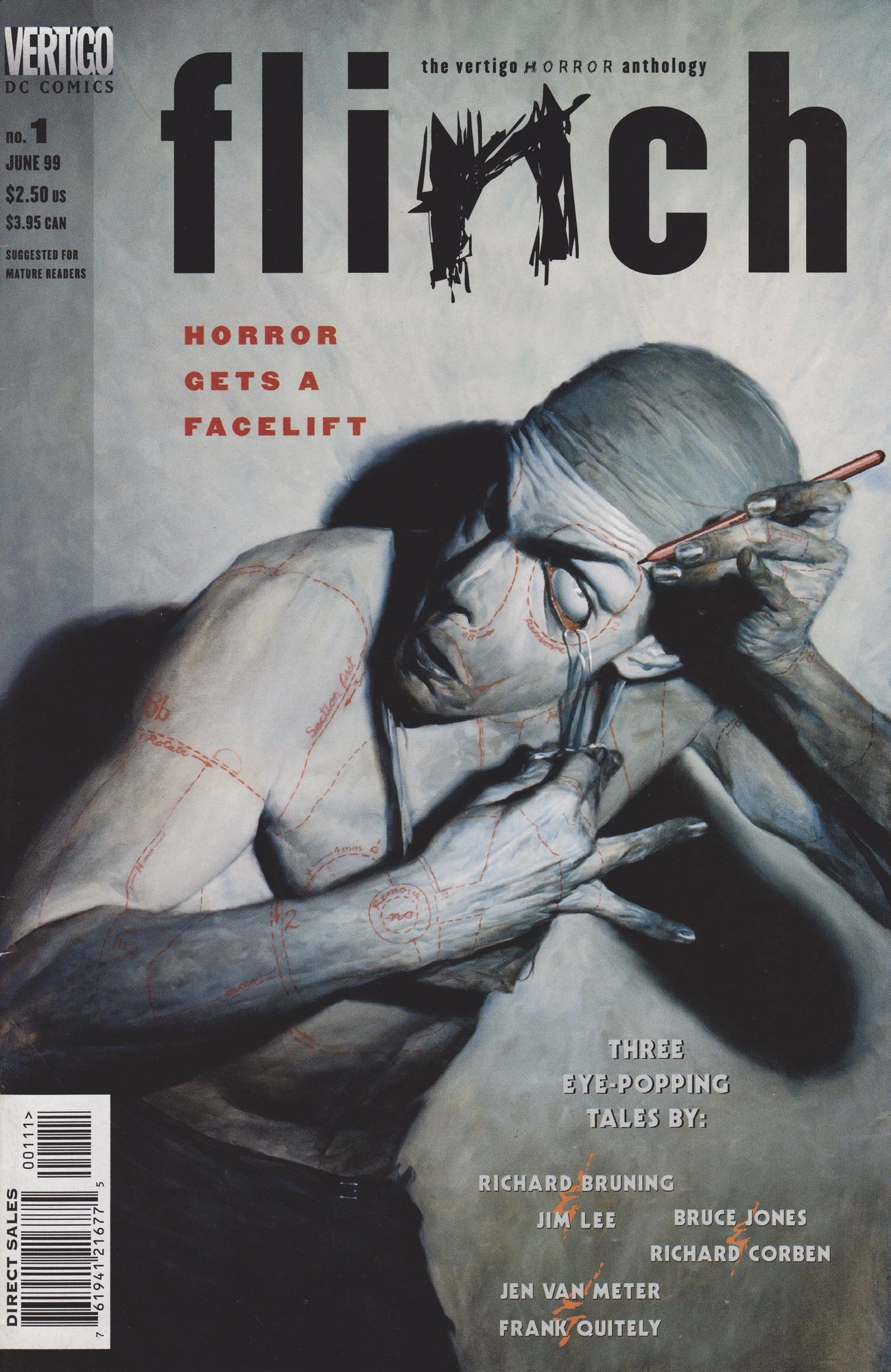 This horror anthology issue presents three distinct stories: a man attempts flight with a homemade rocket pack, a gang formed by the elderly, and a tale centered on a small town cult. Each narrative is illustrated by a different artist, including Jim Lee's debut story art for DC, offering a variety of chilling perspectives in a single volume.