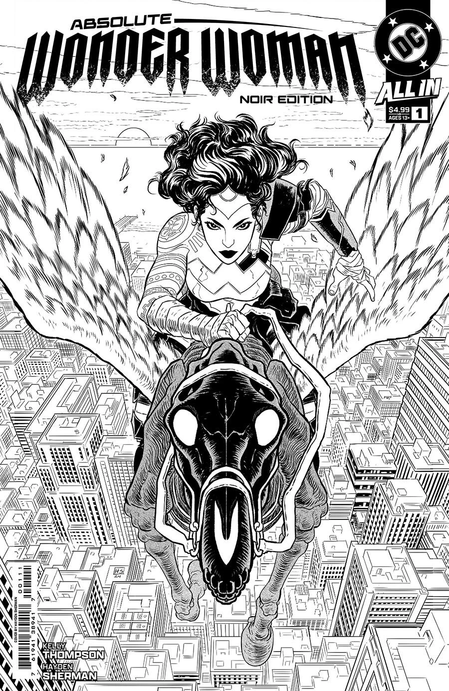This issue reimagines Wonder Woman stripped of her origins and alliances, presenting her as a lone figure in a noir setting. The story unfolds in black and white, emphasizing a grittier, more isolated Amazon navigating a world without her usual support or mission.